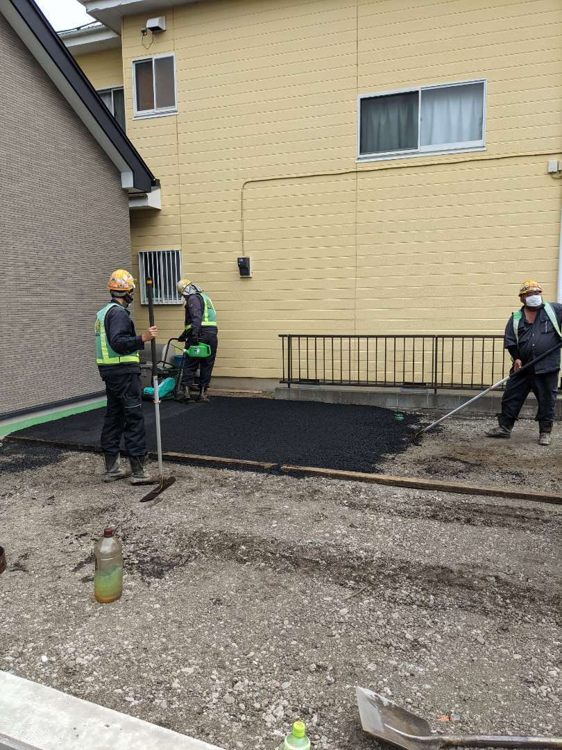 アスファルト舗装工事です。今回は、あまり面積が、ないので、手作業で、舗装してます。