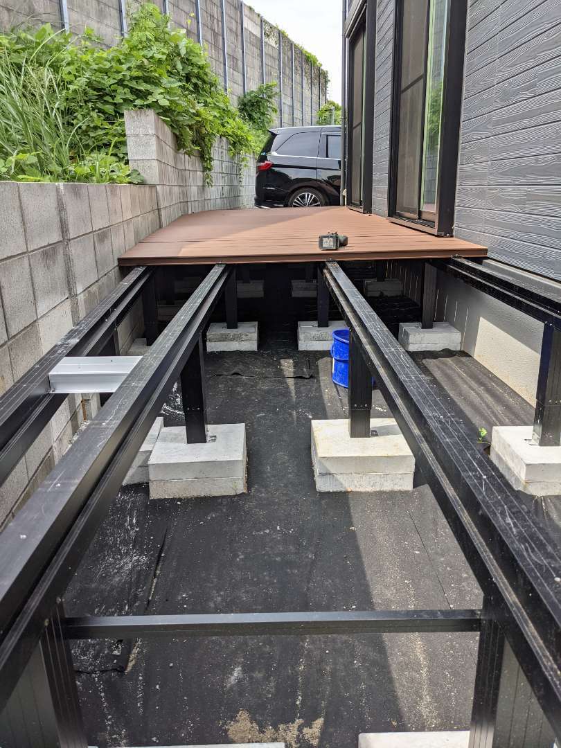 樹脂デッキ施工中です。境界ブロックにギリギリに合わせて目一杯大きく作ってます。骨組みは、アルミ材です。柱もアルミ材で、平板を敷きビスで、柱を固定してます。