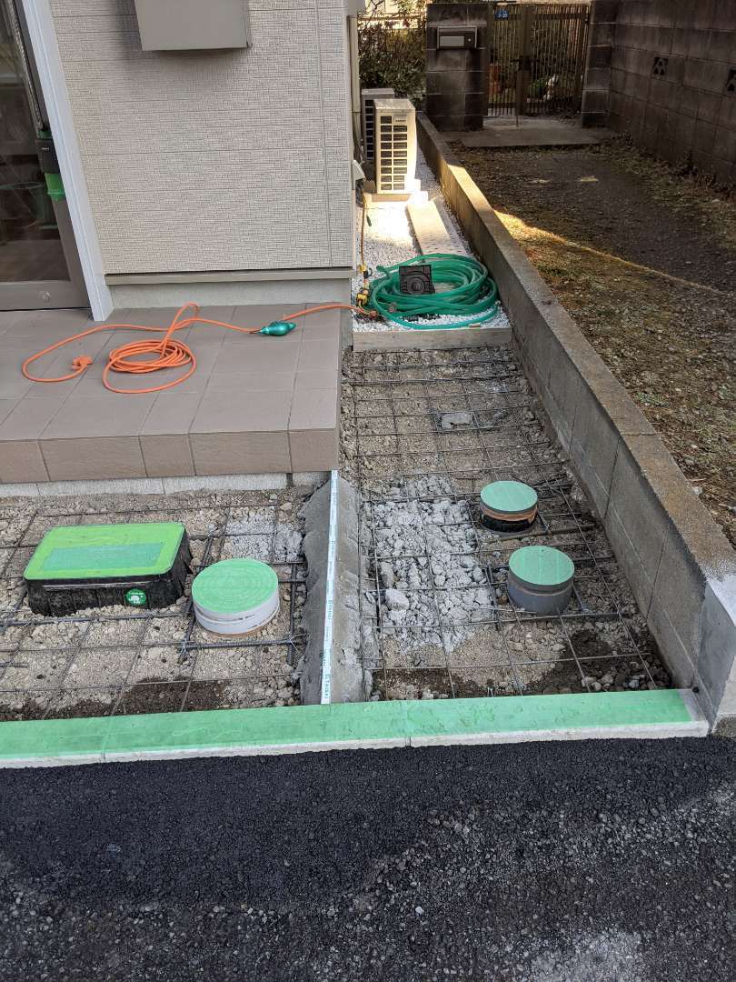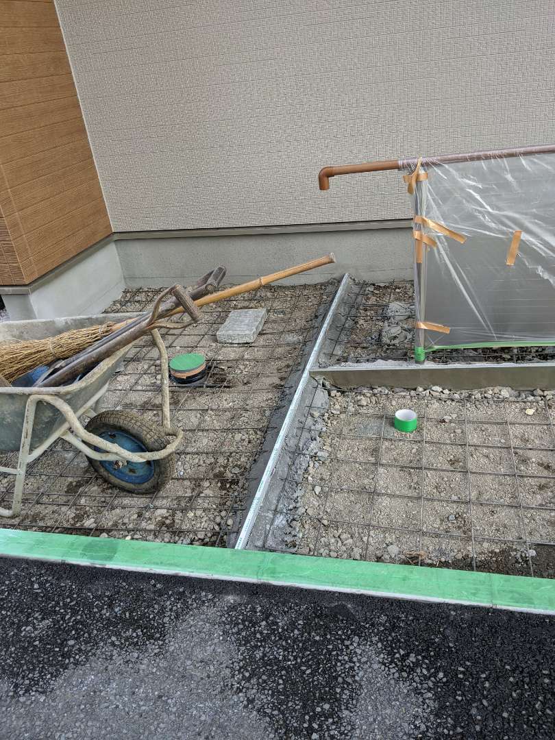 コンクリート下地の状態です。路盤を作って鉄のメッシュを敷、亀裂軽減ざいのエキスパンをせっちします。コンクリート厚さは、約10センチ程です。