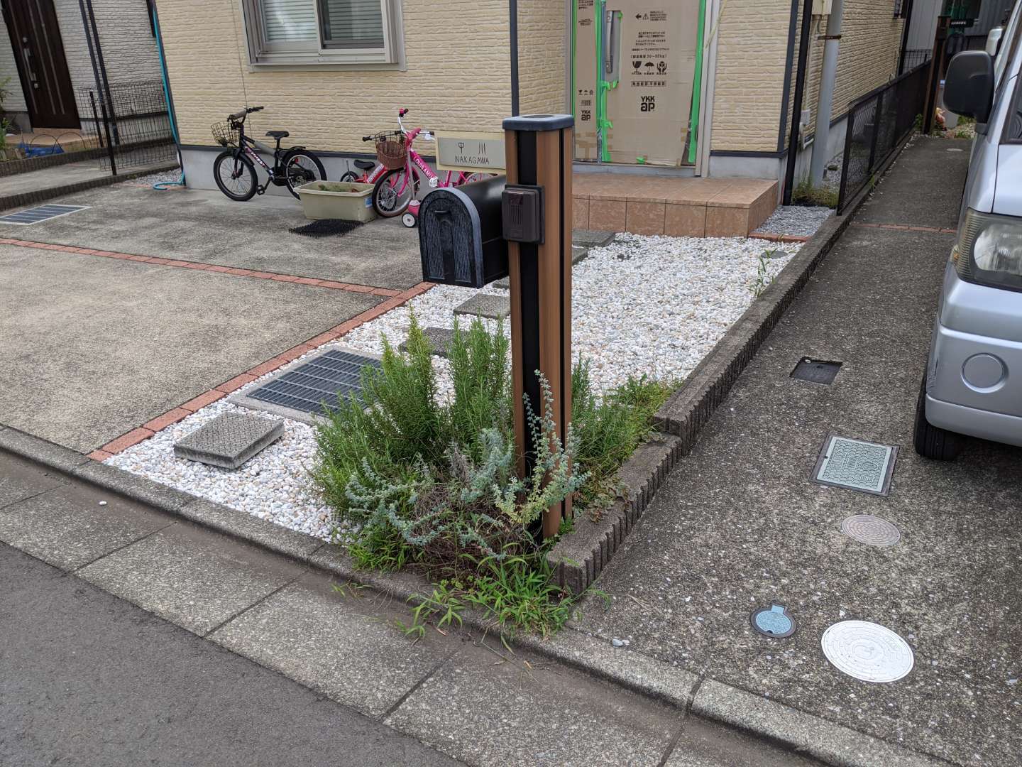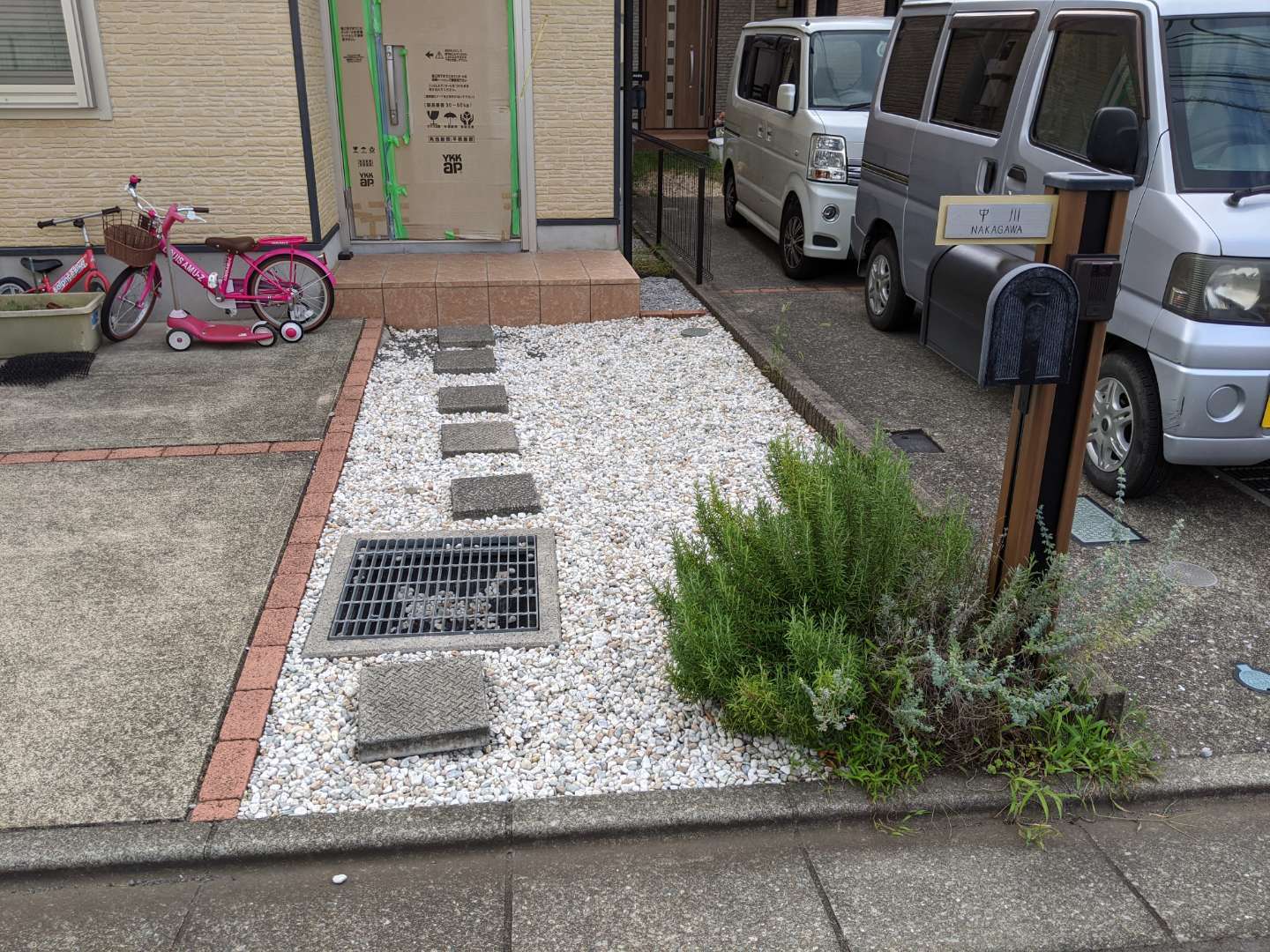 新築の外構です。駐車場コンクリート、石張り、手すり タイル階段